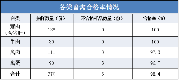 畜禽類產品6份不合格樣品中,禽肉和禽蛋分別檢出3份樣品不合格。