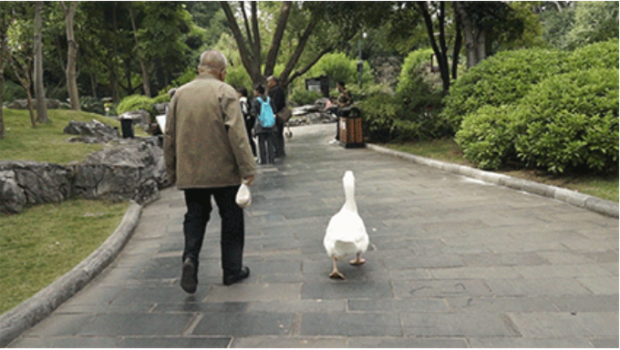 這一人一鵝的“夕陽紅”組合,