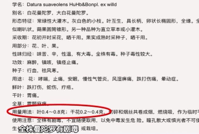 據(jù)了解,曼陀羅又名洋金花,有一定的藥用價(jià)值,但也有毒理作用,有多例報(bào)道介紹過曼陀羅致人中毒事件。據(jù)相關(guān)資料顯示,曼陀羅葉應(yīng)用藥0.4克至0.8克,干花用藥0.2克至0.4克,使用注意事項(xiàng)提及到,全株曼陀羅有劇毒,不宜隨便取用,以免中毒發(fā)生危險(xiǎn)。