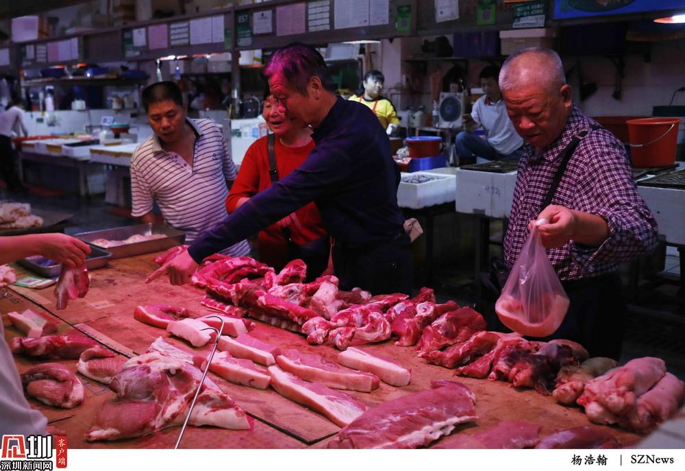 2019年11月18日,福田農批市場,三位正在選購豬肉的市民。