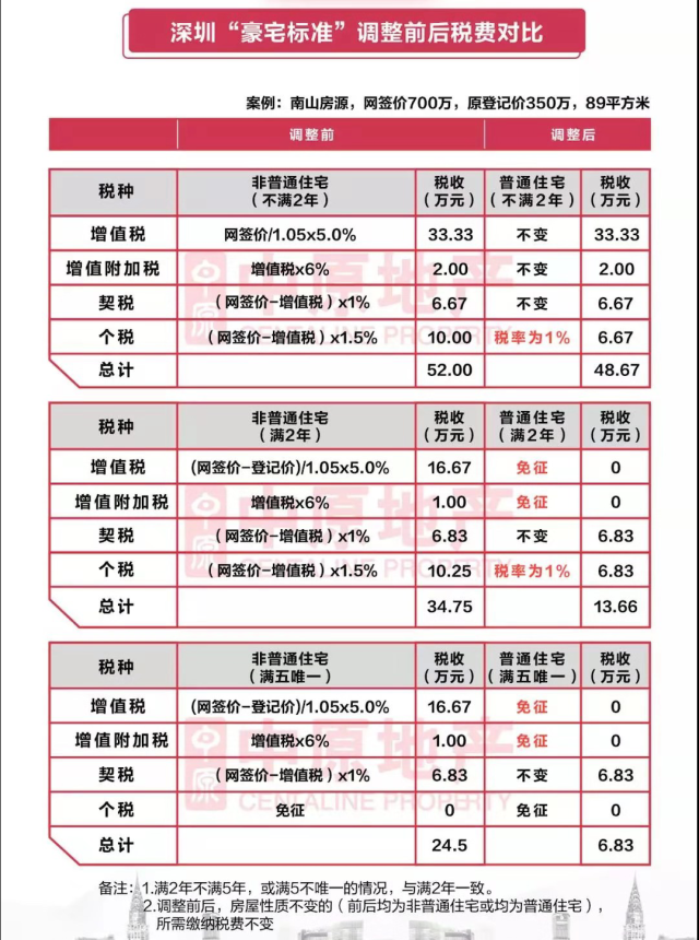 這次調(diào)整中普通住房征收標準發(fā)生了變化。原來一直是以總價來控制,每一個片區(qū)的價格超過多少就是豪宅了,現(xiàn)在則轉(zhuǎn)成按照面積和容積率大小來算:宗地容積率1.0以上且房屋建筑面積144㎡以下。因為我們知道深圳存量房的面積平均都不到100㎡,甚至都不到90㎡,如果按照原來總價來算的話,深圳很多90-100㎡的房子都是豪宅,新規(guī)將讓很多房子都不是豪宅了。這樣對交易成本是一個極大的促進,預計深圳的存量房會明顯地流轉(zhuǎn)起來,進一步加速二手房市場的回暖。