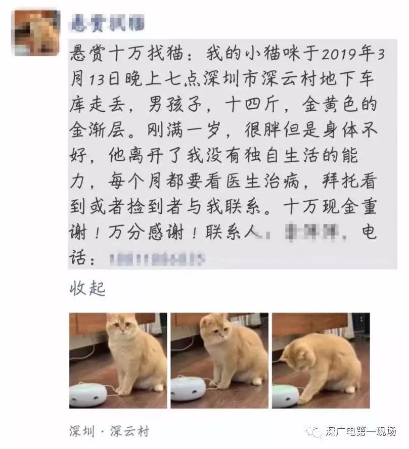 我們欄目之前也報(bào)道過(guò)此類“重金尋寵物”的事件。今年三月深云村居民李女士在朋友圈發(fā)布“十萬(wàn)重金尋貓”的啟事。