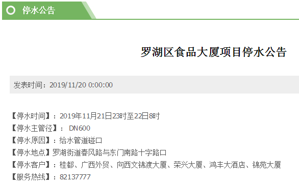 停水時(shí)間:11月21日23時(shí)至22日10時(shí)