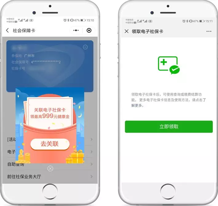 關(guān)聯(lián)完成后,點(diǎn)擊彈窗領(lǐng)取電子社???,在電子社??I(lǐng)取頁面點(diǎn)擊“立即領(lǐng)取”。
