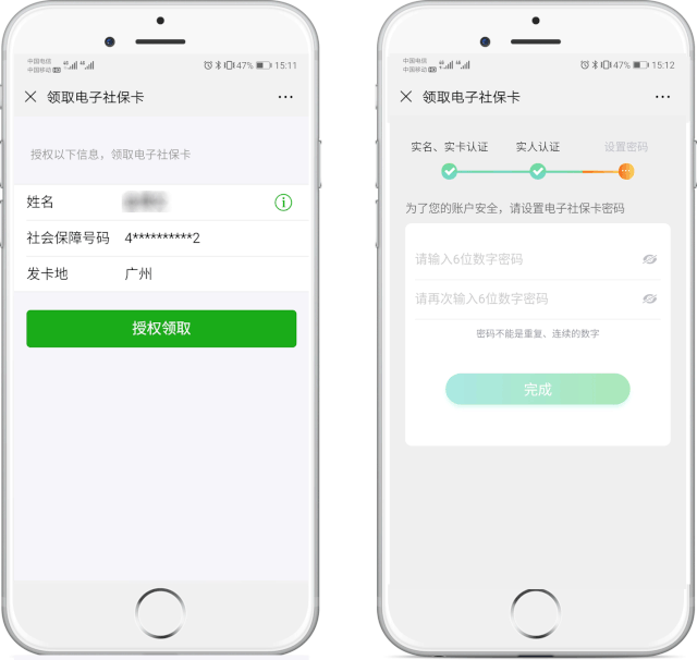 根據(jù)提示授權(quán)領(lǐng)取電子社保卡,并進(jìn)行實(shí)人實(shí)名認(rèn)證后,設(shè)置電子社??艽a,即可完成領(lǐng)取。