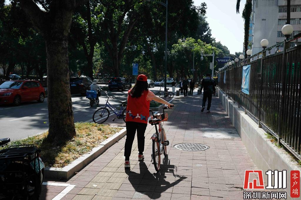 2019年11月22日,福田區(qū),一位義工正在將路邊的共享單車擺放整齊。