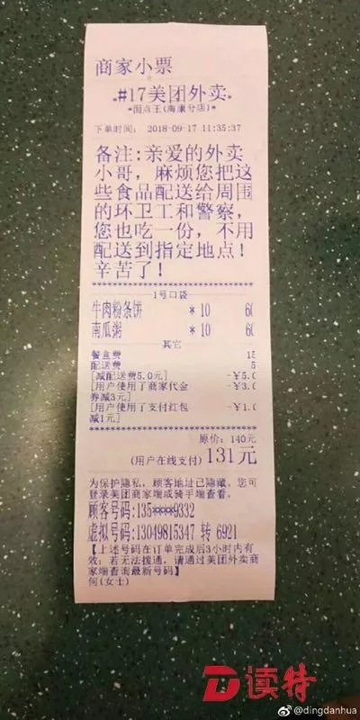 11點(diǎn)35分,面點(diǎn)王又收到了一張訂單。牛肉粉條餅和南瓜粥各10份,共計(jì)131元。員工發(fā)現(xiàn),這張訂單上的備注和名稱與此前的一模一樣,皆是讓外賣小哥送給周圍的環(huán)衛(wèi)工和警察。隨后,面點(diǎn)王其他分店也收到了類似的訂單。據(jù)面點(diǎn)王員工統(tǒng)計(jì),何老師總計(jì)點(diǎn)了1300多元外賣。隨后,這些食物被分成180份送出。