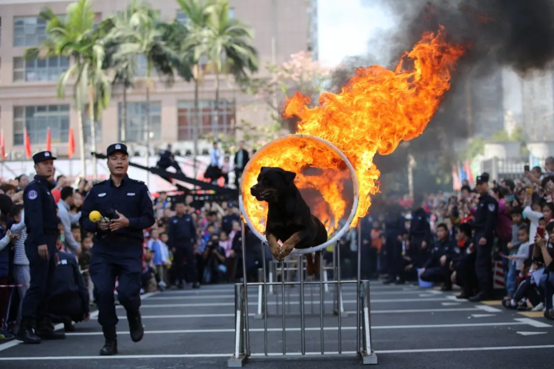 實戰(zhàn)撲咬、解救人質(zhì)、跳火圈……警犬強悍威猛、敏銳靈動,成為了比武展示活動上的焦點。拳術(shù)表演動作利落瀟灑,孔武有力,展現(xiàn)著福田警察的精神風貌,市民朋友贊嘆不已。