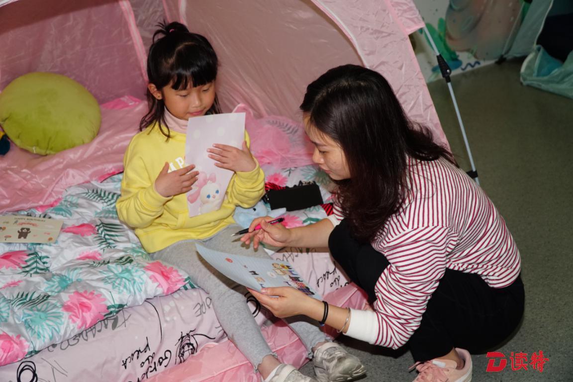 經(jīng)過茶歇小憩之后,親子游戲讓孩子們樂不可支,在呼啦圈游戲中東穿西撞,在九宮格游戲中交朋結(jié)友,在去哪兒游戲里找不著北……這一晚的熱烈在閱讀推廣人鄧歡姐姐的晚安故事中沉淀下來,靜下心來寫下給未來自己的一封信。帳篷、星燈、繪本、游戲,給這30個親子家庭營造了一個個奇妙的童話夢境。