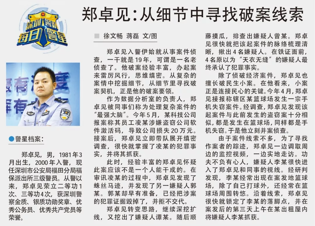 除了偵破經(jīng)濟案件,鄭卓見也擅長破民生小案。在他看來,小案正是連接民心的關(guān)鍵。今年4月,鄭卓見接報稱轄區(qū)某籃球場發(fā)生一宗手機失竊案件。經(jīng)調(diào)查,鄭卓見發(fā)現(xiàn)該起案件與此前發(fā)生的盜竊案十分相似,都是發(fā)生在籃球場,同樣都是手機失竊。于是他立刻并案偵查。