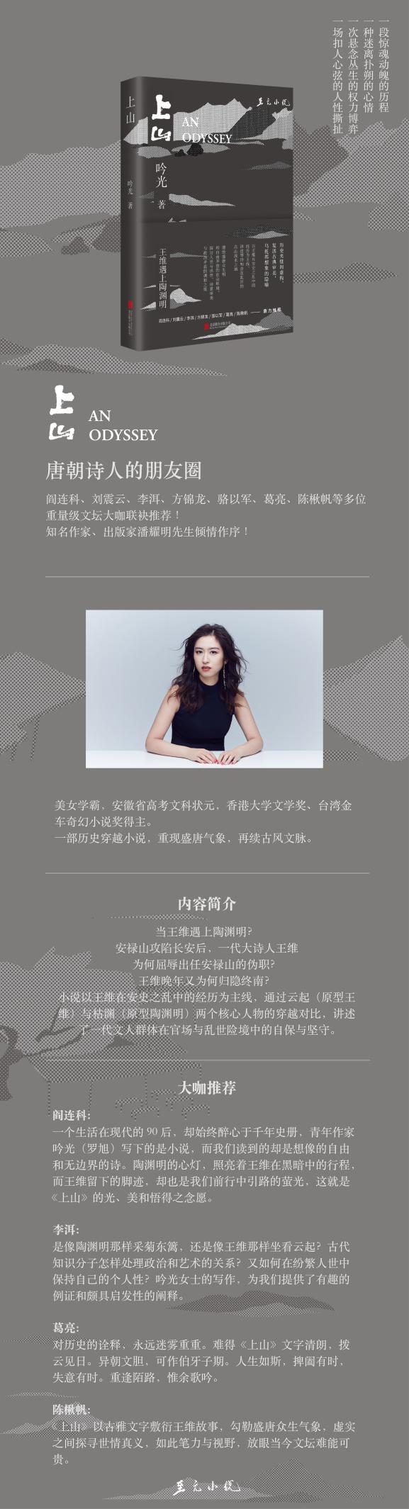 著名作家閻連科表示:“一個(gè)生活在現(xiàn)代的90后,卻始終醉心于千年史冊(cè),青年作家吟光(羅旭)寫下的是小說,而我們讀到的卻是想像的自由和無邊界的詩。陶淵明的心燈,照亮著王維在黑暗中的行程;而王維留下的腳跡,卻也是我們前行中引路的螢光。這就是《上山》的光、美和悟得之念愿?!?/p>