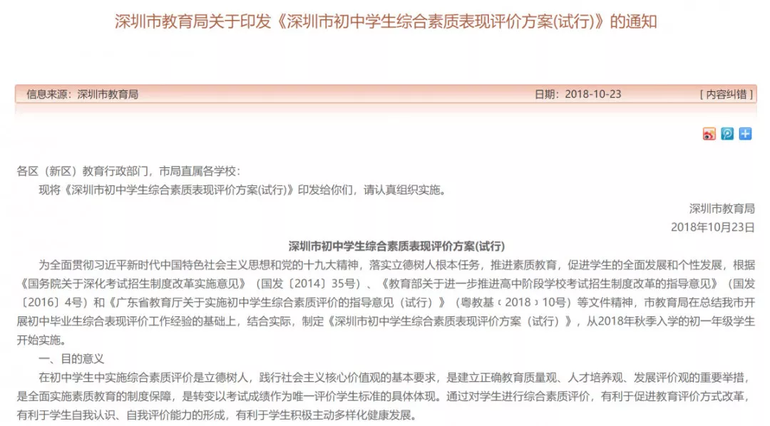 ▲深圳市教育局此前發(fā)布的《深圳市初中學生綜合素質表現(xiàn)評價方案(試行)》