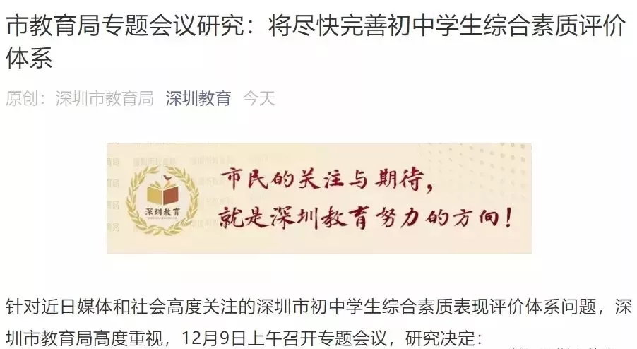 針對近日社會高度關注的深圳市初中學生綜合素質表現(xiàn)評價體系問題,深圳市教育局于今天上午召開專題會議,并作出最新回應:將盡快完善初中學生綜合素質評價體系。