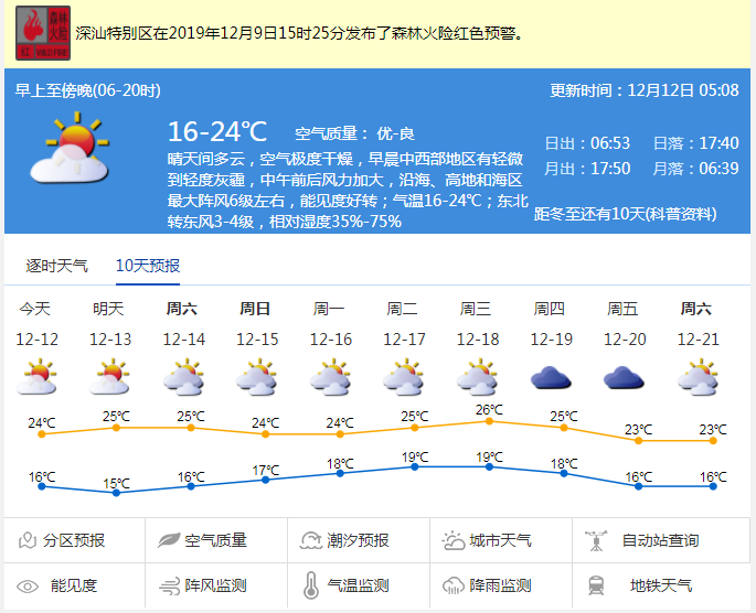12日深圳晴天間多云,空氣極度干燥,早晨中西部地區(qū)有輕微到輕度灰霾,中午前后風(fēng)力加大,沿海、高地和海區(qū)最大陣風(fēng)6級左右,能見度好轉(zhuǎn);氣溫16-24℃。