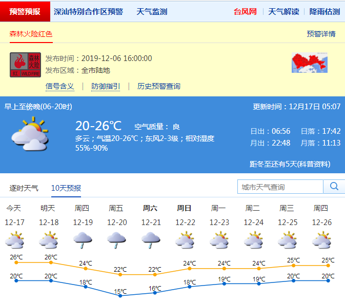 見(jiàn)圳客戶(hù)端·深圳新聞網(wǎng)2019年12月17日訊 深圳市氣象局預(yù)計(jì)17-18日多云,早晚有輕霧,天氣溫暖;19-21日受冷空氣影響,陰天間多云,有分散小雨,氣溫下降,天氣明顯轉(zhuǎn)涼。22日多云,氣溫回升。17-18日早晚有輕霧,注意交通安全。