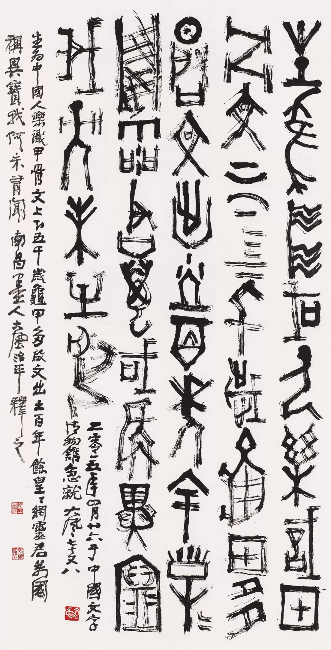 魏治平的甲骨文作品大膽構思,探尋先祖造字奧秘。觀其書法,已經不僅僅是寫,而是用巧妙的結構、對文字進行解構,形成一個整體藝術品。有的字甚至可以根據其落筆的重點、長短等,唱出古曲。