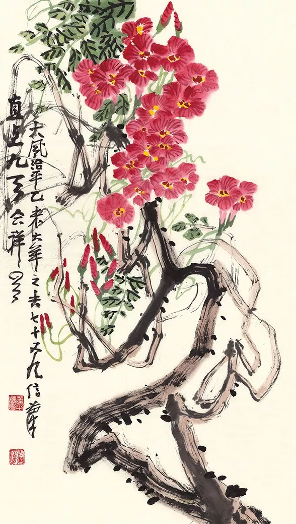 魏治平的藝術貴于創(chuàng)造,以書法入畫,畫中常見有篆書筆意。三十年前長江日報總編海洋先生,曾提筆寫下《魏瘋子傳奇》,洋洋灑灑八千言,一時間荊楚大地震動。西泠印社理事朱妙根稱其“方寸之間有靈山,紅花墨葉又一派”。西泠印社執(zhí)行社長、中國印學博物館館長劉江先生為其第一本書畫作品集題簽書名。美國前總統(tǒng)老布什收有魏老書法作品“龍蛇競走舞長空、點染梅花分外紅。且賦新詩遙寄意,長江密水兩相通”。印第安納州州立大學博物館大廳懸掛的便是魏老八尺紅梅詩書畫中堂。