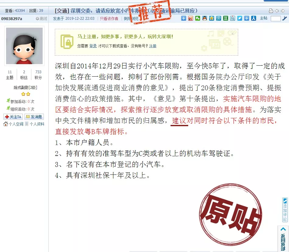 經(jīng)核查,該截圖為網(wǎng)民12月22日在深圳論壇發(fā)布的網(wǎng)帖截選內(nèi)容,完整內(nèi)容是該網(wǎng)民對我市小汽車指標增量調(diào)控政策提出的建議。