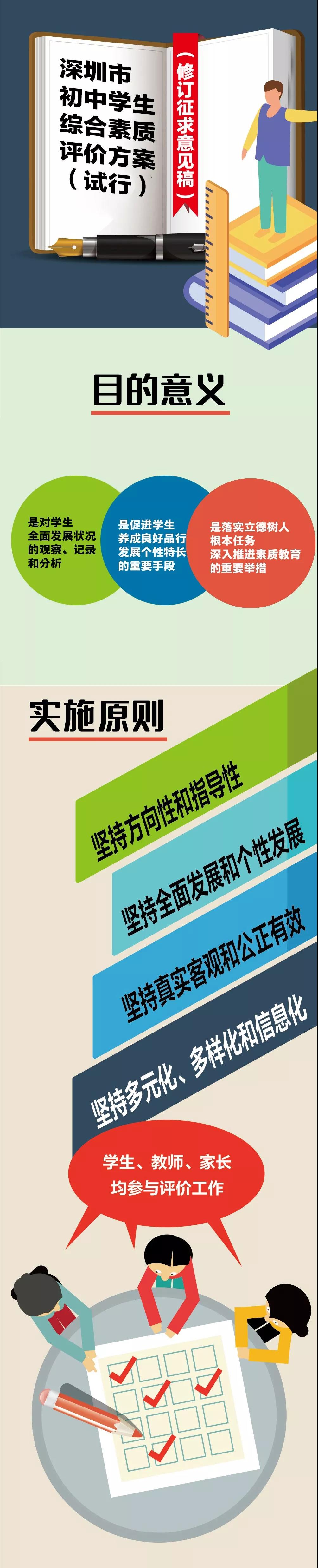 為深入貫徹中共中央、國務(wù)院《關(guān)于深化教育教學(xué)改革全面提高義務(wù)教育質(zhì)量的意見》和《教育部關(guān)于進(jìn)一步推進(jìn)高中階段學(xué)校考試招生制度改革的指導(dǎo)意見》(教基二〔2016〕4號)、《廣東省教育廳關(guān)于實(shí)施初中學(xué)生綜合素質(zhì)評價的指導(dǎo)意見(試行)》(粵教基[2018]10號)等文件精神,落實(shí)立德樹人根本任務(wù),“五育并舉”,促進(jìn)學(xué)生的全面發(fā)展和個性發(fā)展,根據(jù)工作需要,深圳市教育局于2019年12月11日啟動了《深圳市初中學(xué)生綜合素質(zhì)評價方案(試行)》的修訂工作。在大量調(diào)研論證、多方征求意見的基礎(chǔ)上,形成了《深圳市初中學(xué)生綜合素質(zhì)評價方案(試行)(修訂征求意見稿)》。