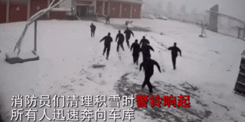 消防員們正在院內(nèi)清理積雪,