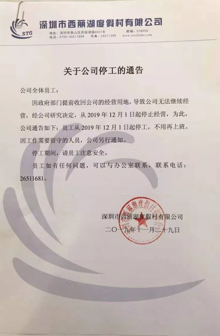 2019年11月29日,西麗湖度假村發(fā)布通告稱,政府提前收回經(jīng)營用地,從2019年12月1日停止?fàn)I業(yè),已經(jīng)不接待外來游客,員工同時(shí)停工——這意味著市民所熟知的西麗湖度假村即將走下舞臺。