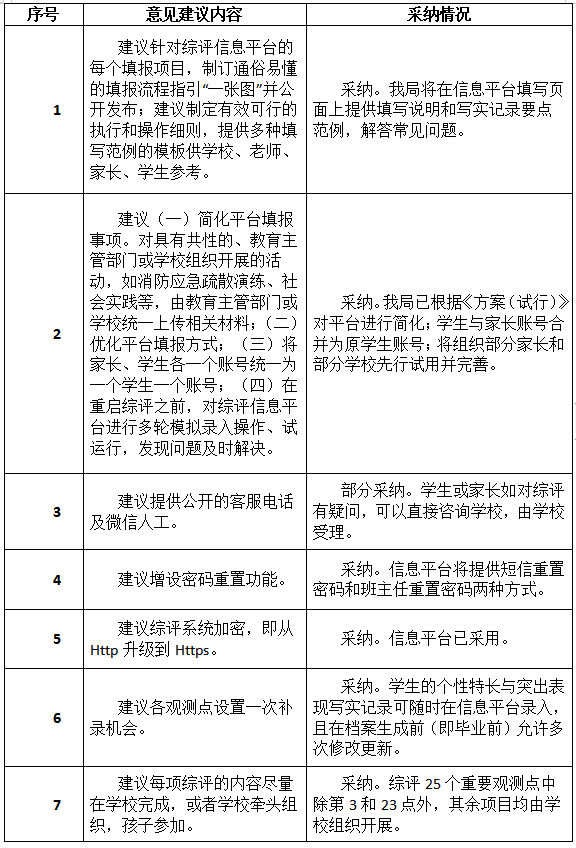 市教育局通報(bào)指出,在意見(jiàn)征集期間,該局共收到304個(gè)郵件及2個(gè)信件。市教育局對(duì)上述建議進(jìn)行了統(tǒng)一的分類(lèi),這些建議被分成了34類(lèi),并組織了專(zhuān)家學(xué)者進(jìn)行了認(rèn)真研究。其中,有關(guān)平臺(tái)簡(jiǎn)化、允許修改更新、建立綜評(píng)宣導(dǎo)隊(duì)伍等14類(lèi)建議被采納,另有5類(lèi)建議被部分采納,余下15類(lèi)建議沒(méi)有被采納。