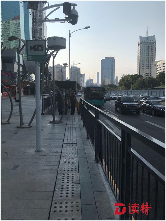 ▲1月14日下午,記者拍攝的深南大道南側(cè)崗廈北地鐵站②公交站,被隔離樁隔離處的人行道非常狹窄,給行人、自行車和上下公交車的乘客都帶來不便。