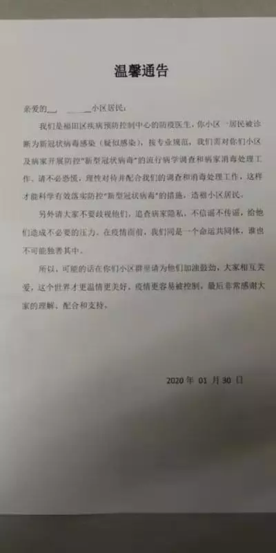 1月30日,由于深圳一小區(qū)出現(xiàn)新冠狀病毒疑似感染病例,福田區(qū)疾病預防控制中心的防疫醫(yī)生發(fā)布了這則通告。通告除了呼吁小區(qū)居民配合調(diào)查及消毒處理工作外,還特地懇請大家“不要歧視,在疫情面前,我們是同一個命運共同體,誰也不可能獨善其身。”不知為何,雖不是湖北人也未曾受過歧視,但還是被這寥寥數(shù)字的“請求”溫暖了。
