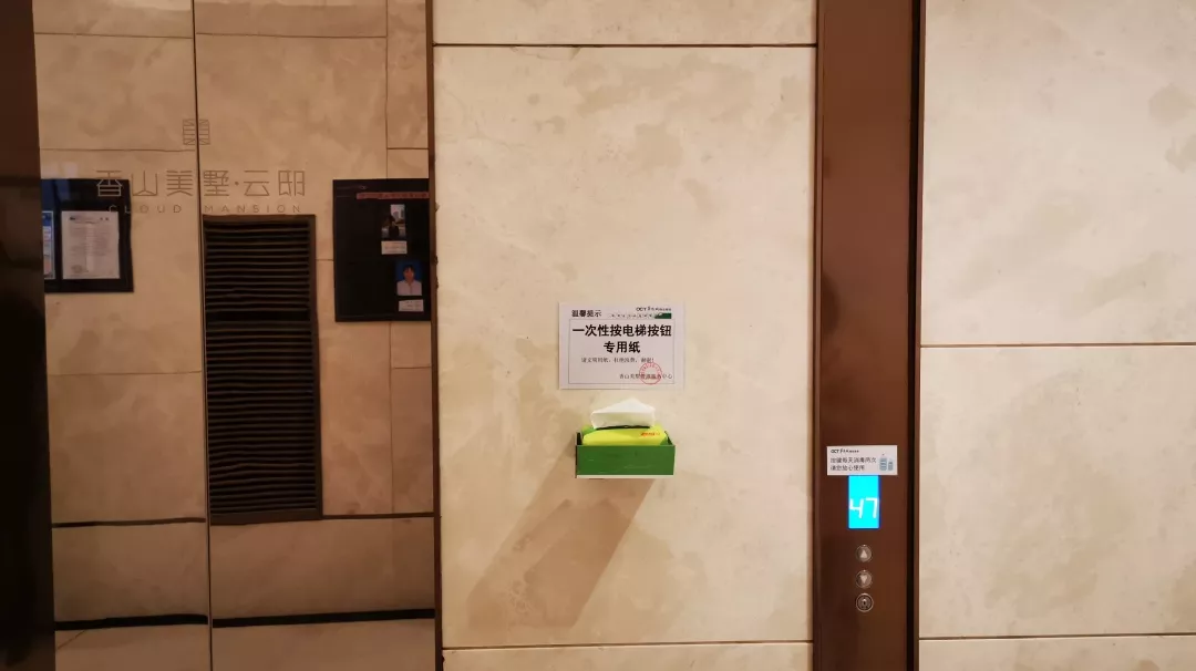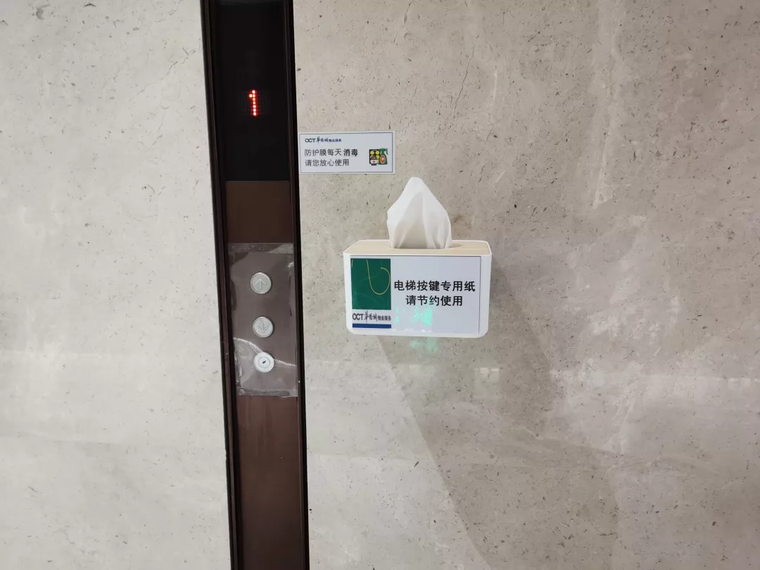 考慮到防控形勢需要,中心對(duì)電梯間及按鈕每天至少不低于2次消毒、且每天更換保鮮貼膜外,又于31日在各個(gè)電梯廳增設(shè)了一次性抽紙,供乘坐電梯按電梯按鈕時(shí)取用。(注:部分樓棟、明天陸續(xù)增設(shè)到位)