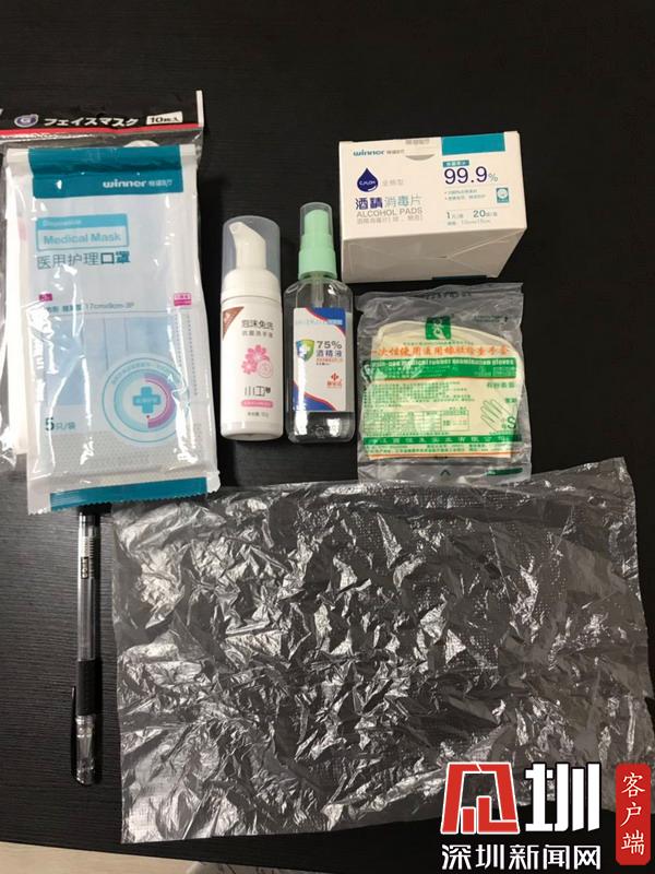 復工佩戴的物品:口罩、一次性手套、酒精消毒片、一支帶筆蓋的筆、工牌、手機都套塑料袋