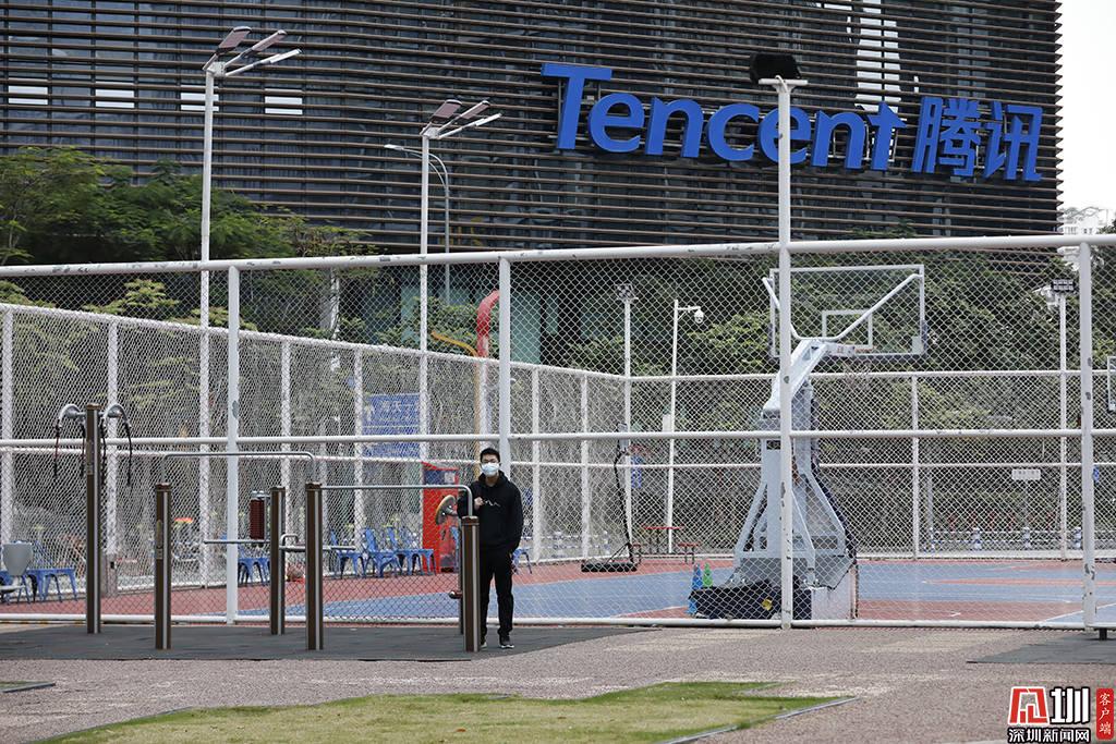 騰訊大廈前,一位戴著口罩的市民。