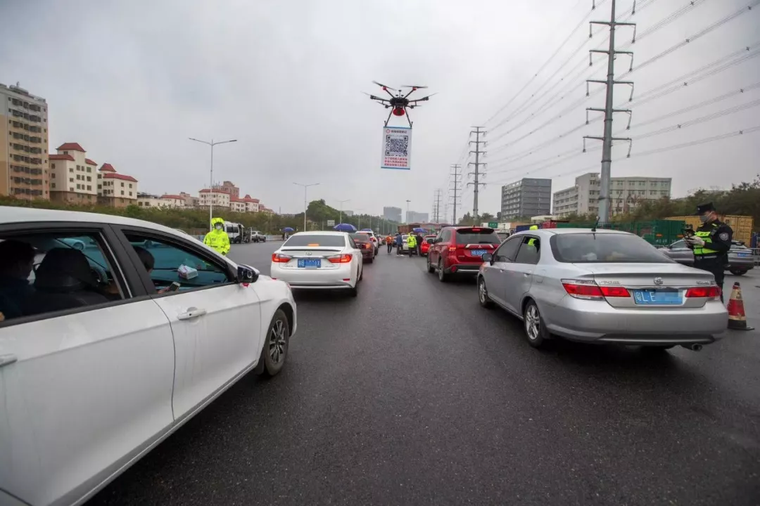 隨著返深車輛和人員的增加,深圳從8日開始啟用線上車輛申報登記。為提高申報效率,搭載喊話器、懸掛申報二維碼的無人機成為防疫一線工作人員的得力助手。民警操作無人機在車輛隊伍中穿梭,并通過喊話器提醒駕乘人員掃碼登記,減少人員接觸的同時提高了效率。