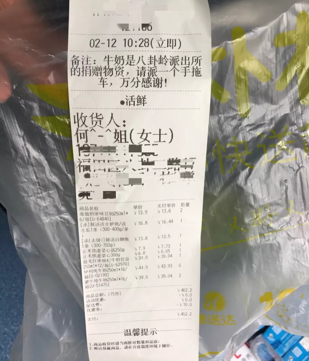 2月12日上午,一名群眾來到深圳市公安局福田分局八卦嶺派出所門口,送上防疫慰問物品。民警問及其姓名和聯(lián)系方式時,她只說:“民警的辛苦我們都看在眼里,這是我作為一名市民的心意和謝意?!北戕D(zhuǎn)身離開了。民警在清點紀(jì)錄物資時,無意中發(fā)現(xiàn)了該熱心市民訂購物資的一張采購單,八卦嶺派出所全體警務(wù)人員在這里對不肯留名的何女士表示衷心的感謝!疫情無情、人民有情,溫暖警心、堅定前行!
