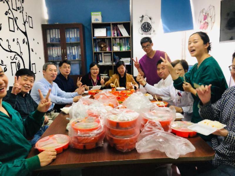 20:40,院領(lǐng)導(dǎo)和專(zhuān)家剛剛討論會(huì)診結(jié)束,病房同事也剛剛完成輪換交接。配餐室突然多了好多人,大家好像約好的似的,都不愿意回去自己過(guò)年。我們相聚一起,不分上下級(jí),我們只是一群同事(其實(shí),劉映霞副院長(zhǎng)也在)一起吃除夕工作餐,一起過(guò)大年。