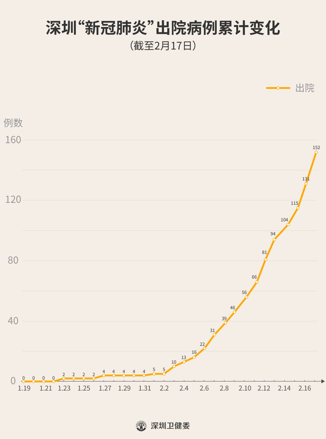 2月17日下午,經(jīng)專家組會(huì)診,深圳再有21名新型冠狀病毒肺炎確診患者出院,累計(jì)達(dá)152人,連續(xù)15天有人出院。