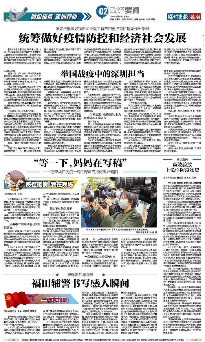 2月3日以來(lái),經(jīng)過(guò)醫(yī)務(wù)防護(hù)、體溫測(cè)量等培訓(xùn)后,輔警陳宇文加入蓮花派出所疫情三人小組。每天早上9時(shí),陳宇文做好自身防護(hù)措施,聯(lián)同社康醫(yī)護(hù)人員、社區(qū)工作站工作人員,對(duì)照疫情核查名單,逐一上門,發(fā)放核查告知書,檢查返深人員情況,配合醫(yī)護(hù)人員測(cè)量體溫,確保不漏一人。核查工作進(jìn)行到22時(shí)后,陳宇文顧不上休息,繼續(xù)張貼防疫宣傳單,連續(xù)工作到凌晨。這樣的工作節(jié)奏,陳宇文已經(jīng)堅(jiān)持了一周多時(shí)間。在陳宇文的努力下,蓮花派出所福新社區(qū)各項(xiàng)隔離措施完善妥當(dāng),為疫情防控打下堅(jiān)實(shí)基礎(chǔ)。