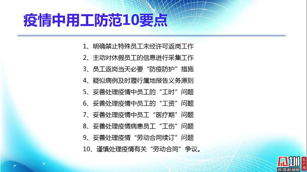 見(jiàn)圳客戶端?深圳新聞網(wǎng)2020年2月18日訊(見(jiàn)圳客戶端、深圳新聞網(wǎng)記者 焦慧茹)疫情影響了社會(huì)的方方面面,給企業(yè)和職工帶來(lái)了新的問(wèn)題。對(duì)于廣大職工而言,擔(dān)心的是疫情期間工資發(fā)放、復(fù)工安排等。對(duì)于企業(yè)而言,擔(dān)心的是如何順利復(fù)工復(fù)產(chǎn)。為此,深圳市總工會(huì)聯(lián)合深圳新聞網(wǎng)推出“復(fù)工防疫微課堂”第六期,邀請(qǐng)講師楊文浩,分析、整理了疫情之下企業(yè)復(fù)工用工防范要點(diǎn),幫助大家解決困惑。