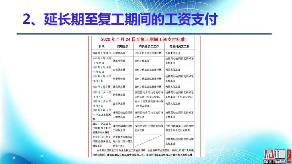 延長(zhǎng)期至復(fù)工期間的工資支付問(wèn)題。延期提前開(kāi)工,足額支付、加班雙倍;延期正常開(kāi)工,遵循法規(guī)、正常出勤;開(kāi)工停工停業(yè),首月按照勞動(dòng)合同規(guī)定正常支付,次月遵法即可;在家網(wǎng)上開(kāi)工,工資照常應(yīng)照常發(fā)放;開(kāi)工不足機(jī)制,輪崗待崗、假期協(xié)商;遵守當(dāng)?shù)胤ㄒ?guī),因地制宜,和諧有道。
