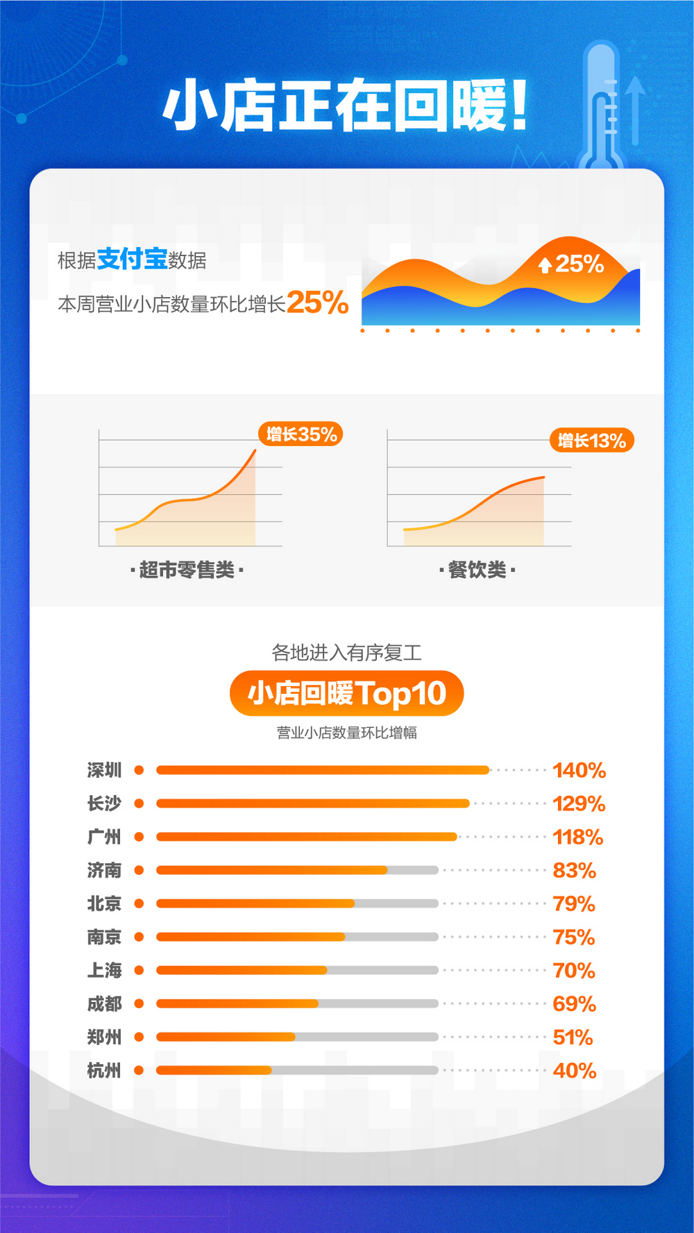 見圳客戶端·深圳新聞網(wǎng)2020年2月19日訊(見圳客戶端、深圳新聞網(wǎng)記者 陳婕)本周全國迎來新一輪復(fù)工潮,來自支付寶的最新數(shù)據(jù)顯示:本周營業(yè)小店數(shù)量環(huán)比增長25%,與百姓生活關(guān)聯(lián)度緊密的超市零售類小店,增幅達(dá)到35%。其中,深圳、長沙、廣州的增幅最大,位列前三。