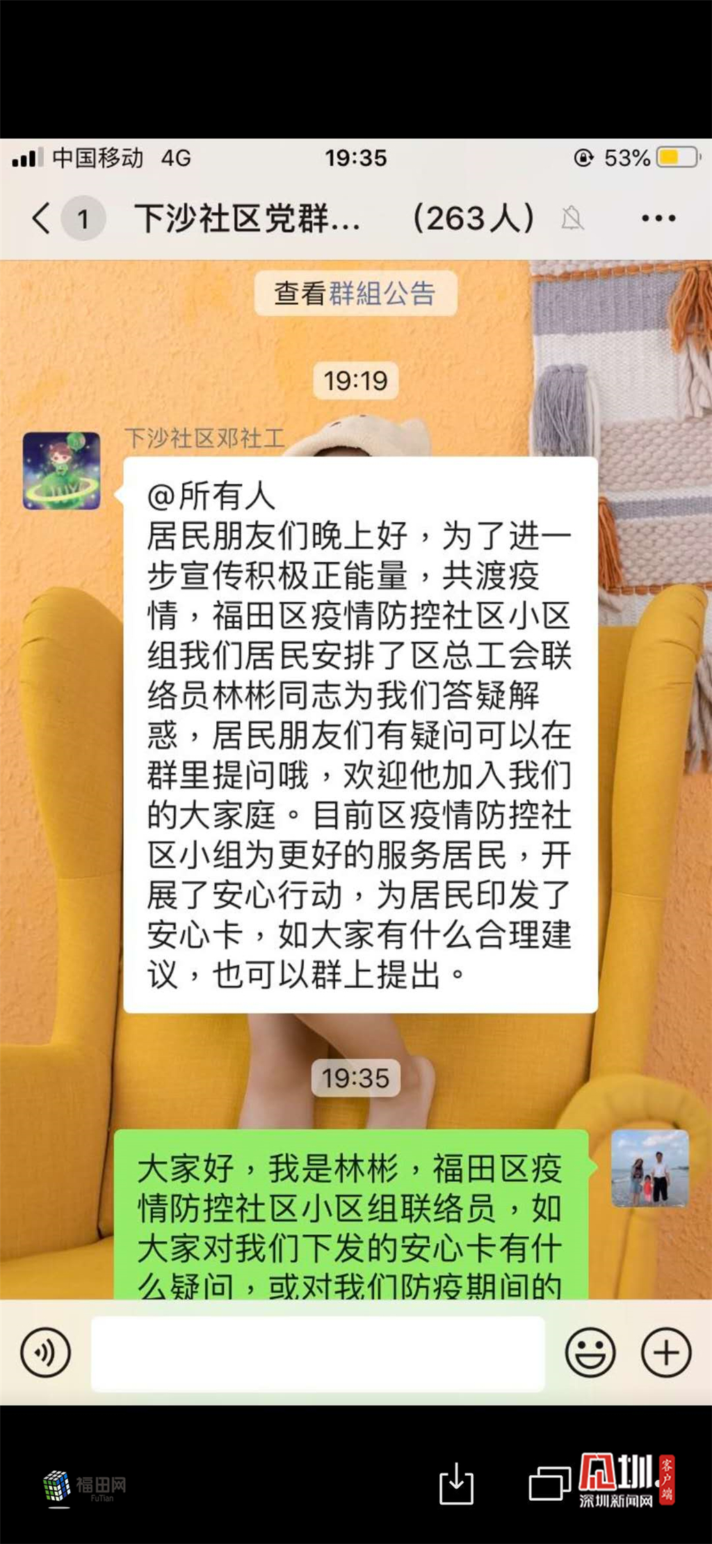 針對(duì)居民最關(guān)心自己居住的小區(qū)是否有確診病例、有無(wú)疑似病例、有無(wú)居家隔離人員的困惑,特別是出現(xiàn)了確診病例小區(qū)的居民更迫切想了解本小區(qū)采取了哪些防疫措施保證居民安全。福田區(qū)安心行動(dòng)第一條就是實(shí)施小區(qū)(村)疫情防控每日一播報(bào)機(jī)制,每個(gè)重點(diǎn)小區(qū),工作組安排一名處級(jí)干部和一名科級(jí)干部化身安心聯(lián)絡(luò)員,進(jìn)到小區(qū)業(yè)主群,督促配合小區(qū)物業(yè)管理處按指定模板公告今日疫情防控播報(bào),保障居民知情權(quán),同時(shí)聽(tīng)取收集居民對(duì)防疫的意見(jiàn)建議,協(xié)調(diào)聯(lián)系解決,并反饋落實(shí)結(jié)果,對(duì)不能馬上解決的做好解釋說(shuō)明。