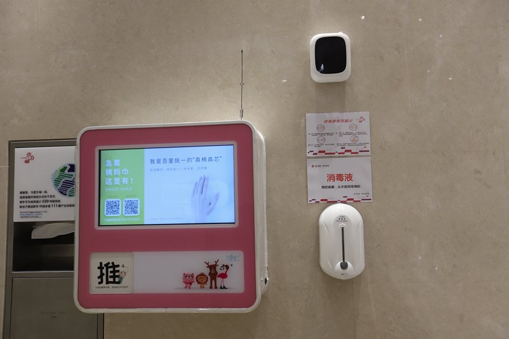 在一樓洗手間記者看到,洗手臺(tái)一側(cè)安置了消毒設(shè)備,并張貼使用提示。據(jù)悉,除了上述防疫物資,壹方城還采購(gòu)了醫(yī)用手套、防護(hù)服、護(hù)目鏡以及消毒噴霧機(jī)3臺(tái)等,在所有出入口新增自動(dòng)消毒設(shè)備55臺(tái),在洗手間配置消毒設(shè)備186臺(tái)。