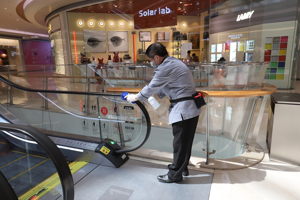 “這些可能與人產(chǎn)生近距離接觸的地方是消毒清潔的重點(diǎn)?!币挤匠俏飿I(yè)負(fù)責(zé)人表示,疫情以來,商場(chǎng)及時(shí)采購(gòu)口罩、手套、防護(hù)服、消毒水等防疫物資,并在原有基礎(chǔ)上進(jìn)一步加強(qiáng)購(gòu)物空間的清潔衛(wèi)生和消毒,尤其是扶梯、電梯、衛(wèi)生間等重點(diǎn)區(qū)位的消殺。此外,商場(chǎng)強(qiáng)化了新風(fēng)系統(tǒng)的工作,保證空氣流通,多管齊下,確保衛(wèi)生工作嚴(yán)標(biāo)準(zhǔn)、多頻次、無死角。
