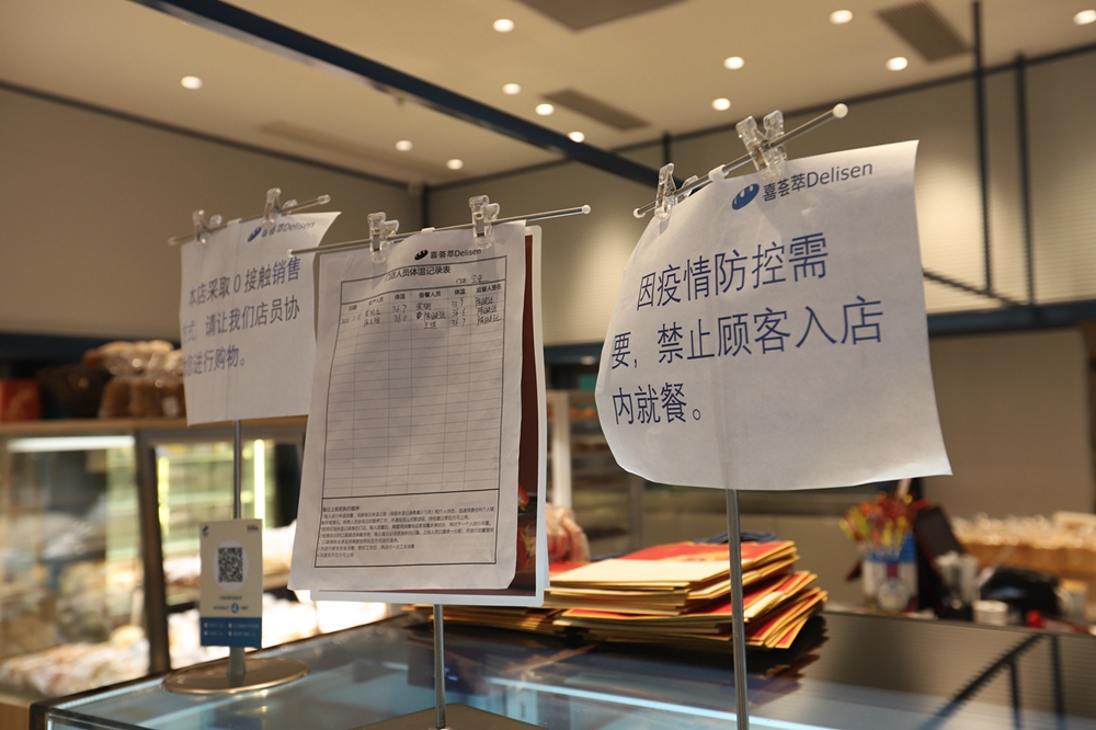 負(fù)二樓的喜薈萃是一家剛開業(yè)沒多久的面包店,記者看到里面燈光明亮、各式面包充盈貨賀,進(jìn)店的通道已全部攔堵,并設(shè)置了取餐及消毒區(qū)。一名市民正在選購(gòu)面包,他站在店外選好款式后,店員將面包打包好并放在取餐處,市民掃碼付款后就可以帶走了。這就是商場(chǎng)內(nèi)實(shí)行的“零接觸”購(gòu)物。