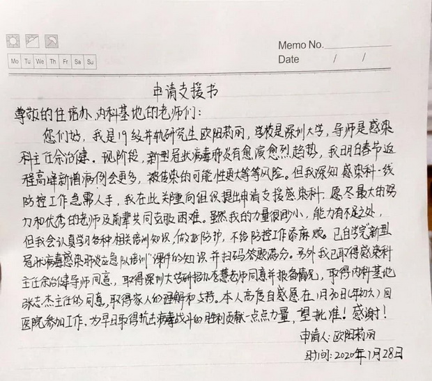 作為內科學傳染病方向的研究生,疫情爆發(fā)后,盡管學校和住培辦通知學生在家待命,但歐陽莉麗深知院里感染科一定很需要人手,于是經(jīng)過層層申請,終獲得支援批準。大年初五返深后,歐陽莉麗當晚便進行采樣培訓,初六便開始值班,至今依然奮戰(zhàn)在這個崗位上。