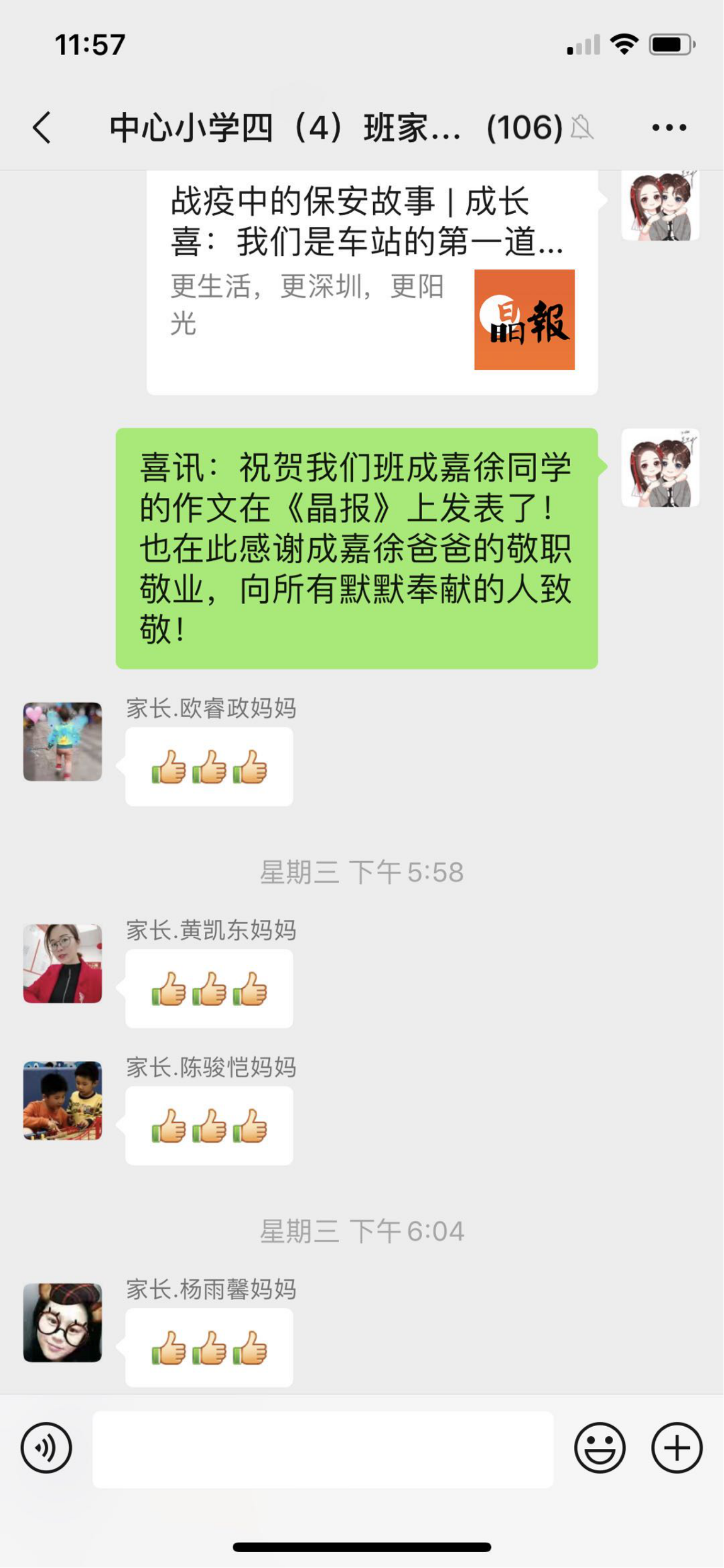 莫老師在班級(jí)群和朋友圈里分享學(xué)生發(fā)表的作文。