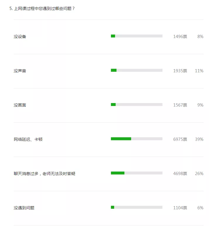 僅有6%的參與者在網(wǎng)課中從未遇到障礙。39%的參與者曾遇到網(wǎng)絡卡頓、延遲的問題,20%的參與者曾遇到網(wǎng)課沒聲音、沒網(wǎng)絡等問題。