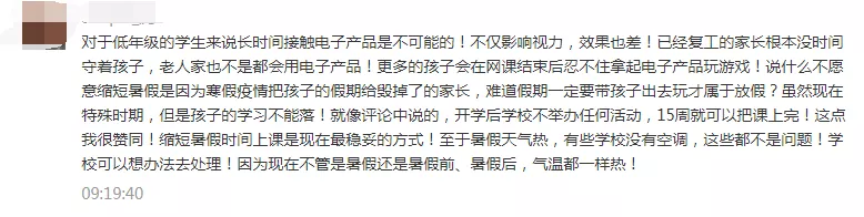 一些參與者留言建議減少或暫停網(wǎng)課時(shí)間,縮短周末或暑假時(shí)間進(jìn)行補(bǔ)課。