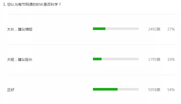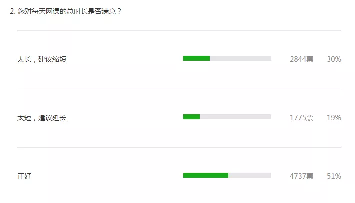 對于網(wǎng)課的時(shí)長,大部分參與者持積極態(tài)度。超過半數(shù)的網(wǎng)友認(rèn)為每節(jié)網(wǎng)課的時(shí)長和每天網(wǎng)課的總時(shí)長比較科學(xué)。