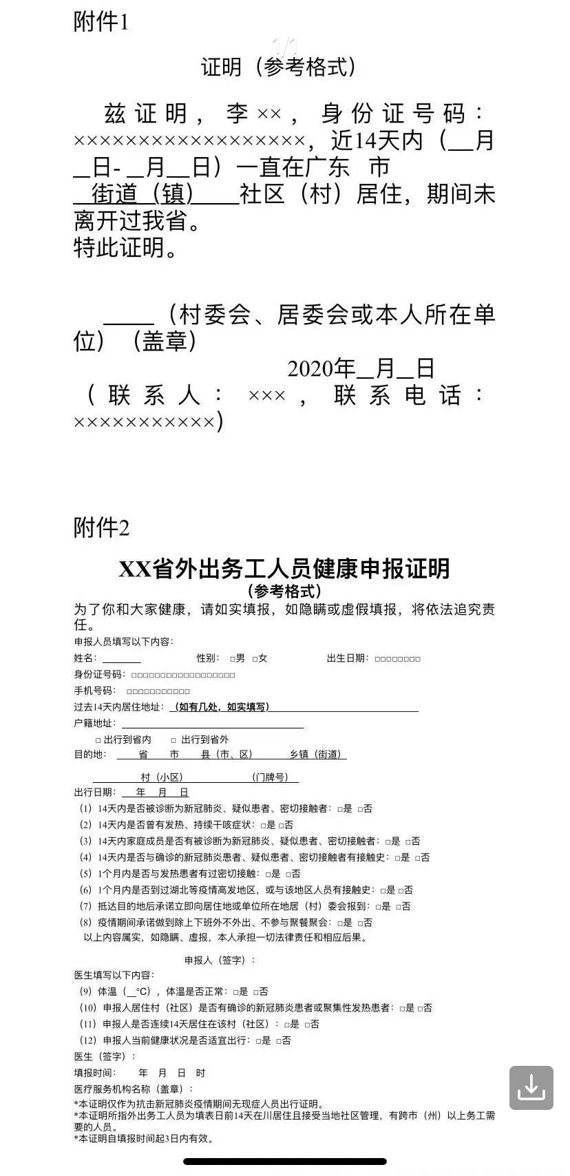 二、對持湖北省等疫情高發(fā)地區(qū)身份證來粵人員,如能提供中國移動、中國電信和中國聯(lián)通發(fā)布的個人軌跡證明信息,證明本人14天內(nèi)未離開過廣東、未到過疫情高發(fā)地的,可到社區(qū)(居委或村委)或本人所在單位申領證明(見附件1)。