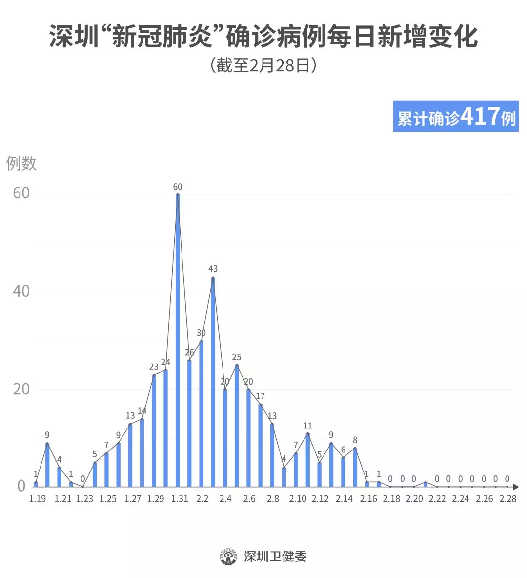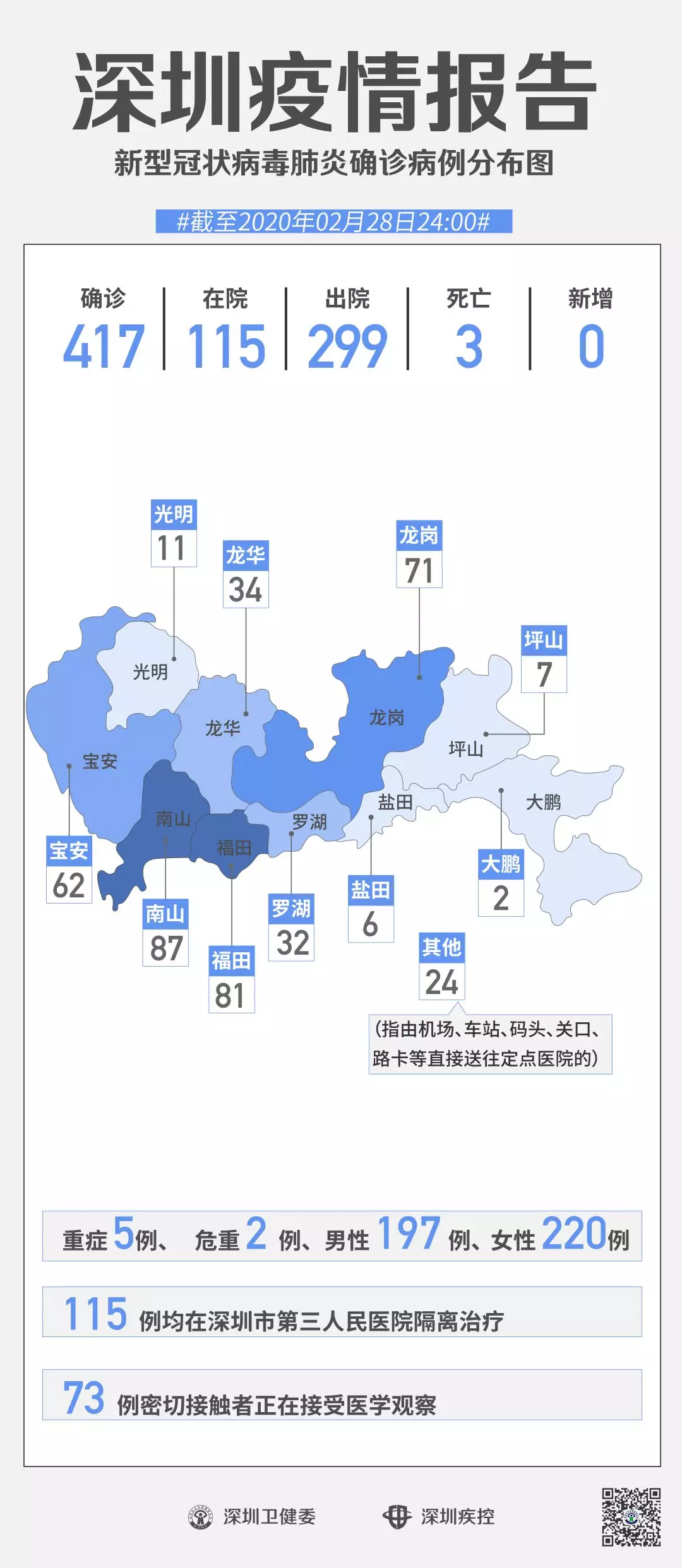 截至2月28日24時,深圳累計報告“新冠肺炎”確診病例417例。2月28日當天全市無新增確診病例,當天出院病例18例(從26日起不再公布出院個案)。